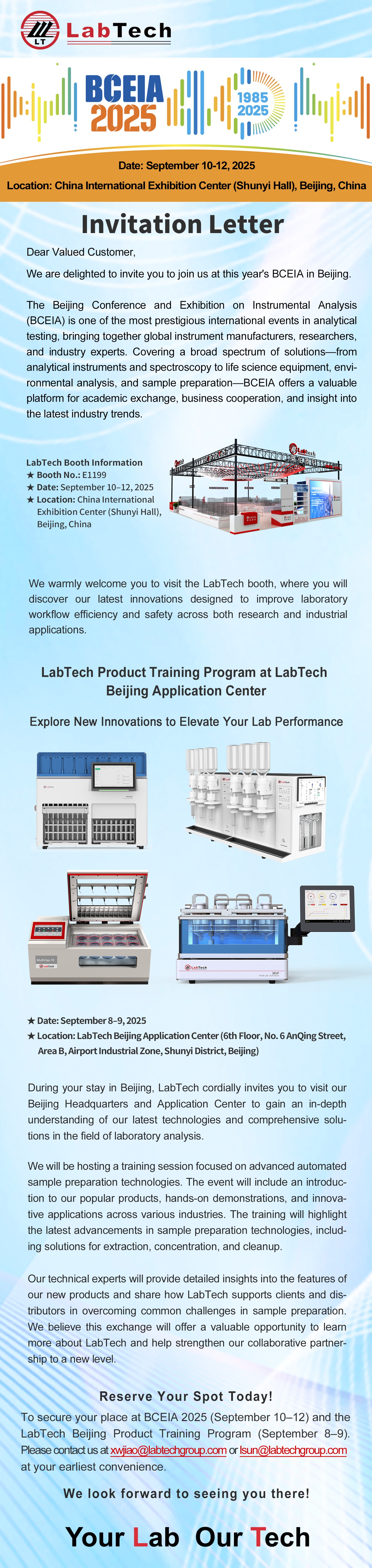 To secure your place at BCEIA 2025 and the LabTech Beijing Product Training Program, please contact us at xwjiao@labtechgroup.com or lsun@labtechgroup.com at your earliest convenience.